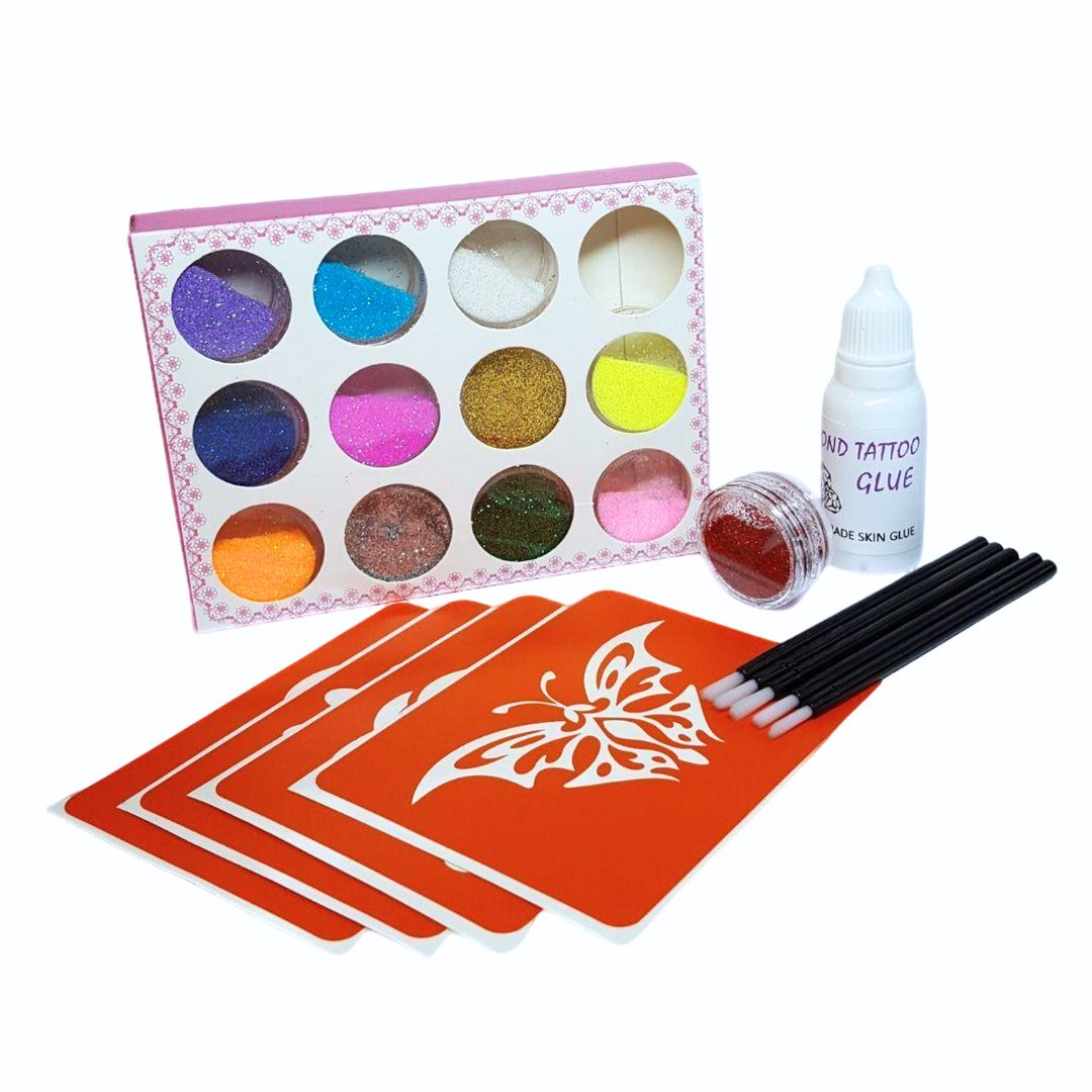 Komplektā ir speciāla līme glitter-tetovējumu uzklāšanai uz ķermena. Turas ap 10 dienas. Neizraisa alerģiju uz ādas, ūdensnoturīga.